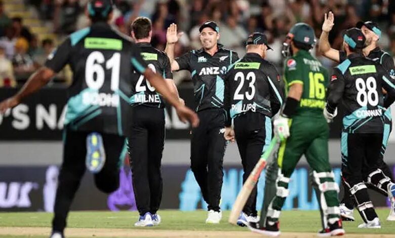 लाहौर। न्यूजीलैंड ने चौथे टी-20 मुकाबले में पाकिस्तान को चार रन से हराकर पांच मैचों की सीरीज में 2-1 से बढ़त बना ली है। 179 रनों के लक्ष्य का पीछा करते हुए पाकिस्तान की टीम 20 ओवर में आठ विकेट पर 174 रन ही बना सकी और मुकाबला चार रन से हार गई। पाकिस्तान की शरुआत खराब रही और 46 रन पर अपने तीन विकेट गवां दिए। कप्तान बाबर आजम (5), सईम अय्यूब (20), उसामा खान (16) रन बनाकर आउट हुए।