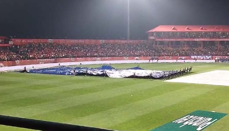 धर्मशाला के एचपीसीए क्रिकेट स्टेडियम में पंजाब किंग्स और आरसीबी के बीच खेले जा रहे आईपीएल मैच में फिलहाल बारिश और ओलावृष्टि ने खलल डाल दिया है। 10 ओवरों का खेल खत्म होने के साथ ही बारिश शुरू हो गई जिसके चलते मैच को रोकना पड़ा है। 10 ओवरों के बाद आरसीबी का स्कोर तीन विकेट पर 119 रन है। विराट कोहली 23 गेंदों में 42 रन बनाकर नाबाद हैं जबकि अगला बल्लेबाज अभी क्रीज पर नही आ पाया था।