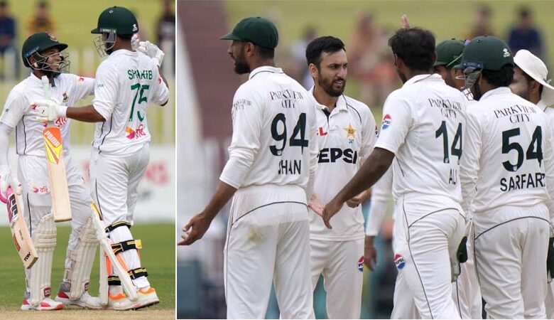 पाकिस्तान की ओर से मीर हमजा, खुर्रम शहजाद, अबरार अहमद और आगा सलमान ने एक-एक बल्लेबाज को आउट किया। इससे पहले टेस्ट मैच के चाथे दिन सोमवार को हसन महमूद (पांच विकेट) और नाहिद राणा (चार विकेट) की घातक गेंदबाजी के दम पर बंगलादेश ने पाकिस्तान को दूसरी पारी में 172 के स्कोर पर ढ़ेर करने के बाद 184 रन का लक्ष्य मिला था। बारिश शुरु होने से पहले बंगलादेश ने दूसरी पारी में बिना कोई विकेट खोए 42 रन बना लिये थे। पाकिस्तान की ओर से दूसरी पारी में सईम अयूब (20), शान मसूद(28), बाबर आजम (11), सऊद शकील (एक) रन बनाकर आउट हुए। एक समय पाकिस्तान ने 81 के स्कोर पर अपने छह विकेट गवां दिये थे। ऐसे समय में मोहम्मद रिजवान (43) और आगा सलमान नाबाद (47) ने पारी को फिर संभाला। हसन महमूद ने 37वें ओवर में मोहम्मद रिजवान को आउट कर इस साझेदारी को तोड़ा। इसके बाद के चार बल्लेबाज तू चल मैं आया की तर्ज पर एक के एक पवेलियन लौट गये। पाकिस्तान की दूसरी पारी 46.4 ओवर में 172 के स्कोर पर सिमट गई।