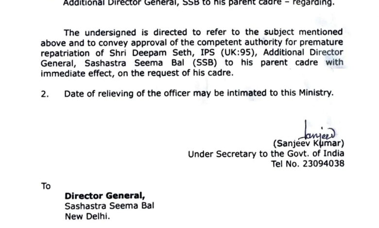 देहरादून। सशस्त्र सीमा बल (एसएसबी) के अतिरिक्त महानिदेशक दीपम सेठ अपने मूल कैडर उत्तराखंड लौट रहे हैं। केंद्रीय गृह मंत्रालय ने 1995 बैच के आईपीएस दीपम सेठ को मौजूदा कार्यकाल खत्म होने से पहले ही तात्कालिक प्रभाव से उत्तराखण्ड के लिए रिलीव कर दिया है। यह आदेश केंद्रीय गृह मंत्रालय में उपसचिव संजीव कुमार की ओर से जारी किया गया। 23 नवंबर को केंद्रीय गृह मंत्रालय के इस फैसले के बाद प्रदेश में स्थायी डीजीपी की नियुक्ति को लेकर कयास तेज हो गए हैं।