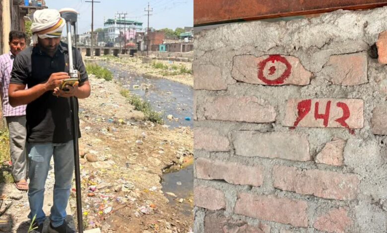 लोक निर्माण विभाग की टीम हटाने वाले मकानों पर लगा रही लाल निशान